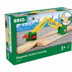 With this magnetic action crossing for railway road traffic is stopped through the power of magnetism when a train is passing. Push down to lift the bar and let the cars cross the BRIO train tracks.